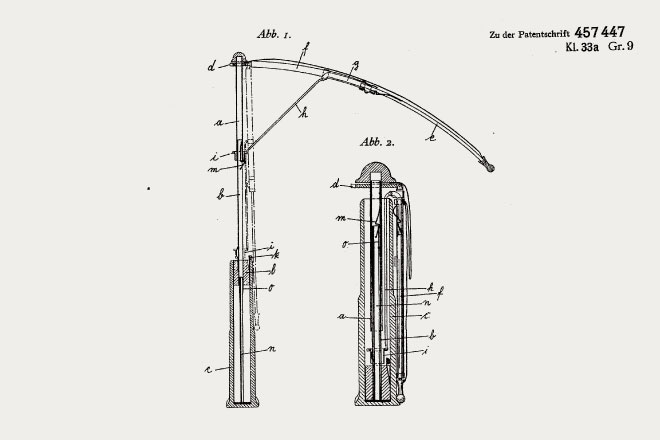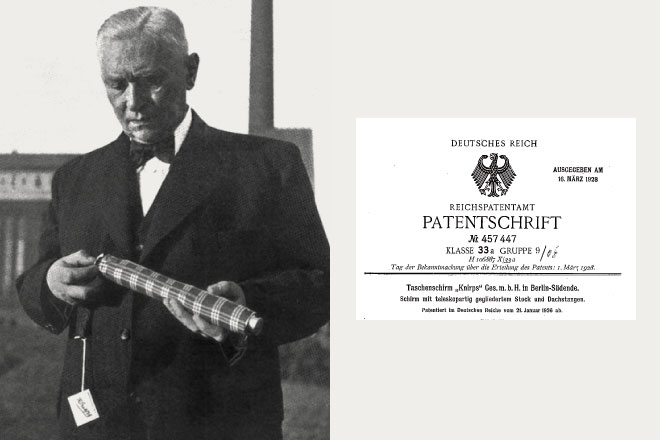 Knirps(クニルプス)の生みの親で、エンジニアのHans Haupt(ハンス・ハウプト)は、足が悪く、雨が降りそうな外出時には片手にステッキ、もう一方の手に長傘を持たなくてはなりませんでした。不便に感じた彼は、「ポケットに入るくらい小さい傘を作れないだろうか。」と考えます。そして1928年Hans Haupt は折りたたみ傘の構造を考案し、1928年3月16日に折りたたみ傘の特許を取得しました。現在、3月16日は「折りたたみ傘の日」として、一般社団法人日本記念日協会に記念日登録されています。